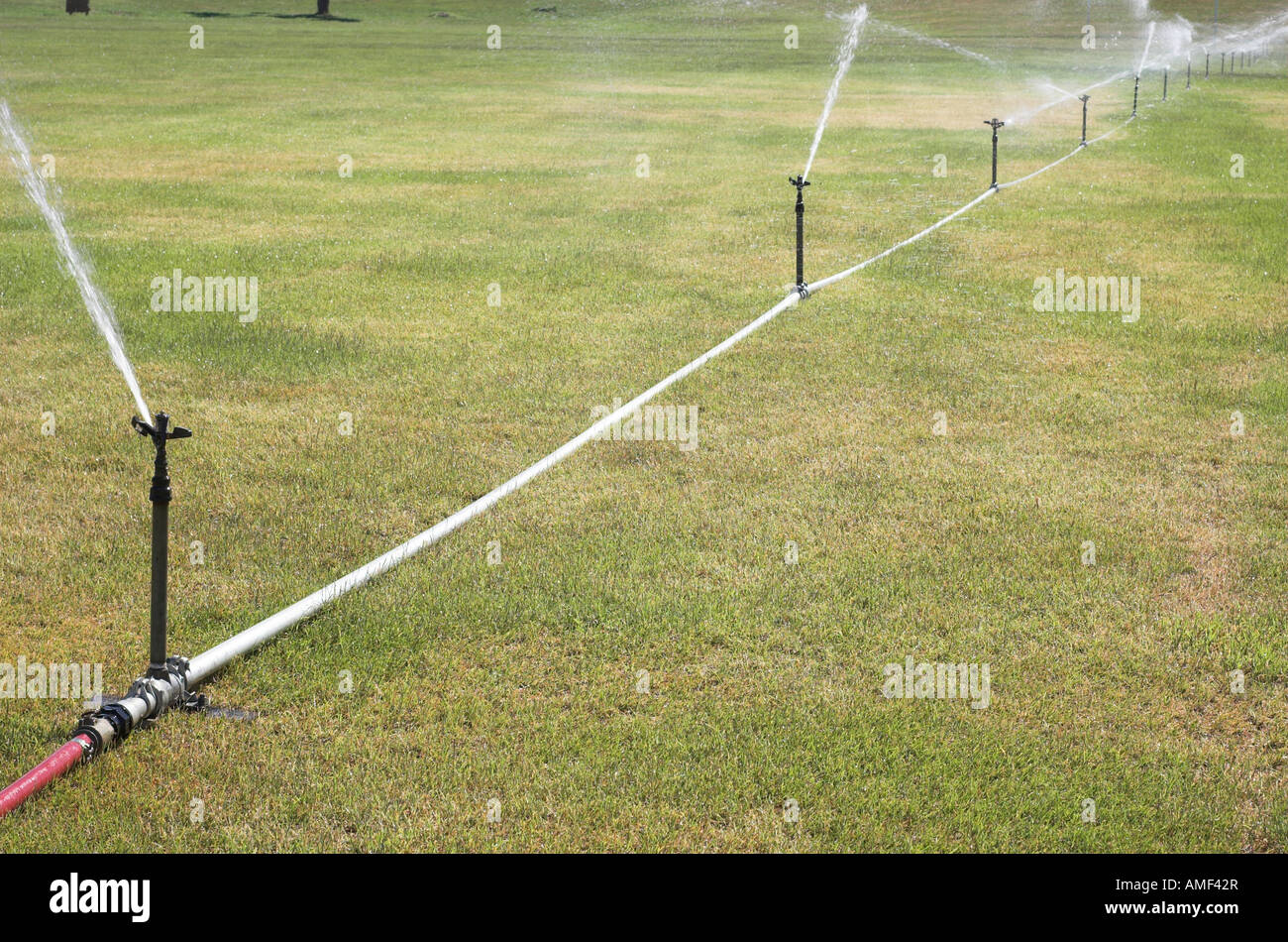 Ein Bewasserungssystem Das Bespruhen Mit Wasser Uber Einen Sportplatz Auf Den Rasen In Den Trockenen Sommermonaten Pflegen Stockfotografie Alamy